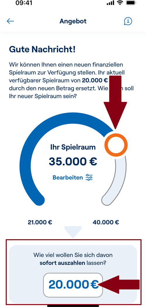 Aus Sicherheitsgründen ist lediglich eine erneute Legitimation erforderlich. Nach erfolgreicher Beantragung können Sie direkt in der App die Auszahlung des gesamten Betrags oder einer Teilsumme veranlassen.