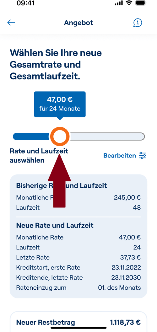 6. Wählen Sie die neue Monatsrate sowie die neue Laufzeit.