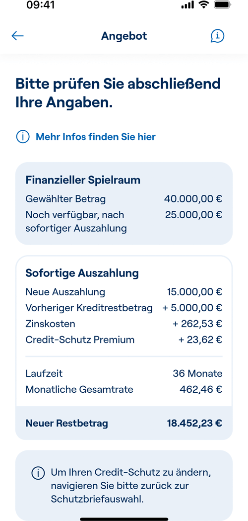 In der fairen Credit App können Sie Ihren Kredit jederzeit bequem erhöhen – eine ausreichende Bonität vorausgesetzt. Dabei schließen Sie einen neuen Vertrag ab, der Ihren bisherigen ersetzt. Viele Ihrer Daten sind bereits hinterlegt, sodass Sie nichts neu eingeben müssen – ein kurzer Check reicht, um sicherzustellen, dass alles aktuell ist.