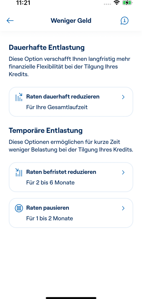 Sie können Ihre monatliche Kreditrate für ein oder zwei Monate pausieren. Bitte beachten Sie: Nach einer Ratenreduzierung oder Ratenpause ist eine erneute Zahlungserleichterung erst wieder nach sechs Monaten möglich.