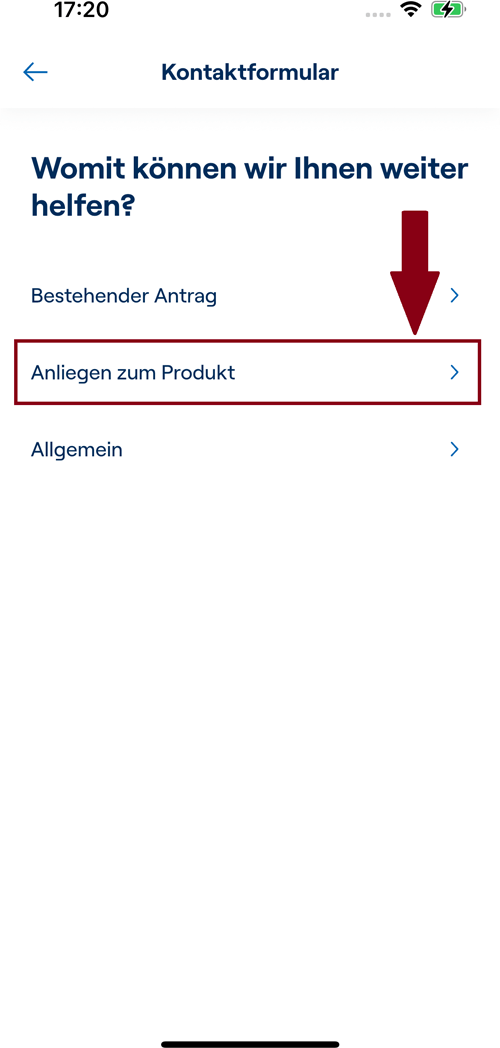 4. Wählen Sie dann „Anliegen zum Produkt“.